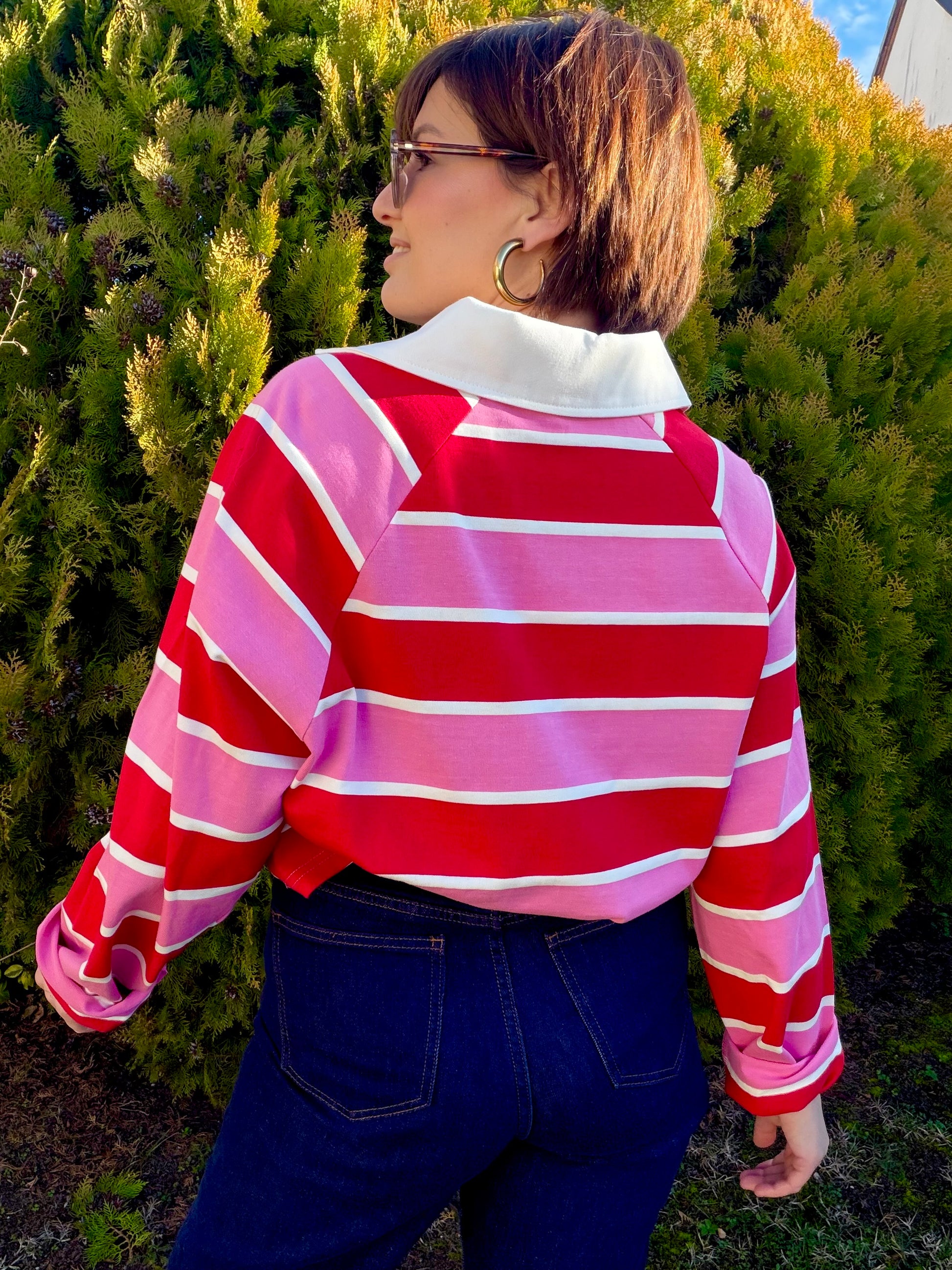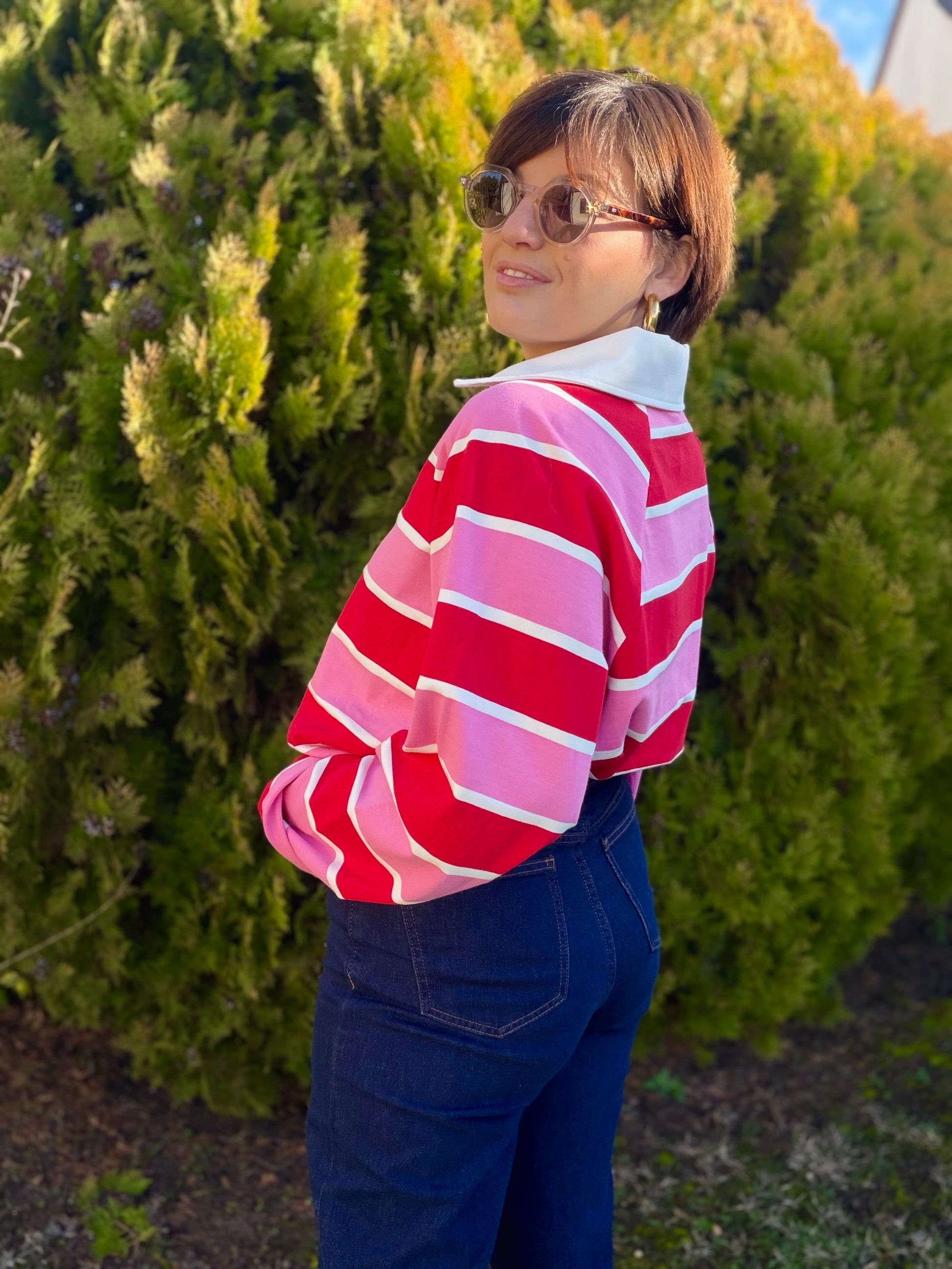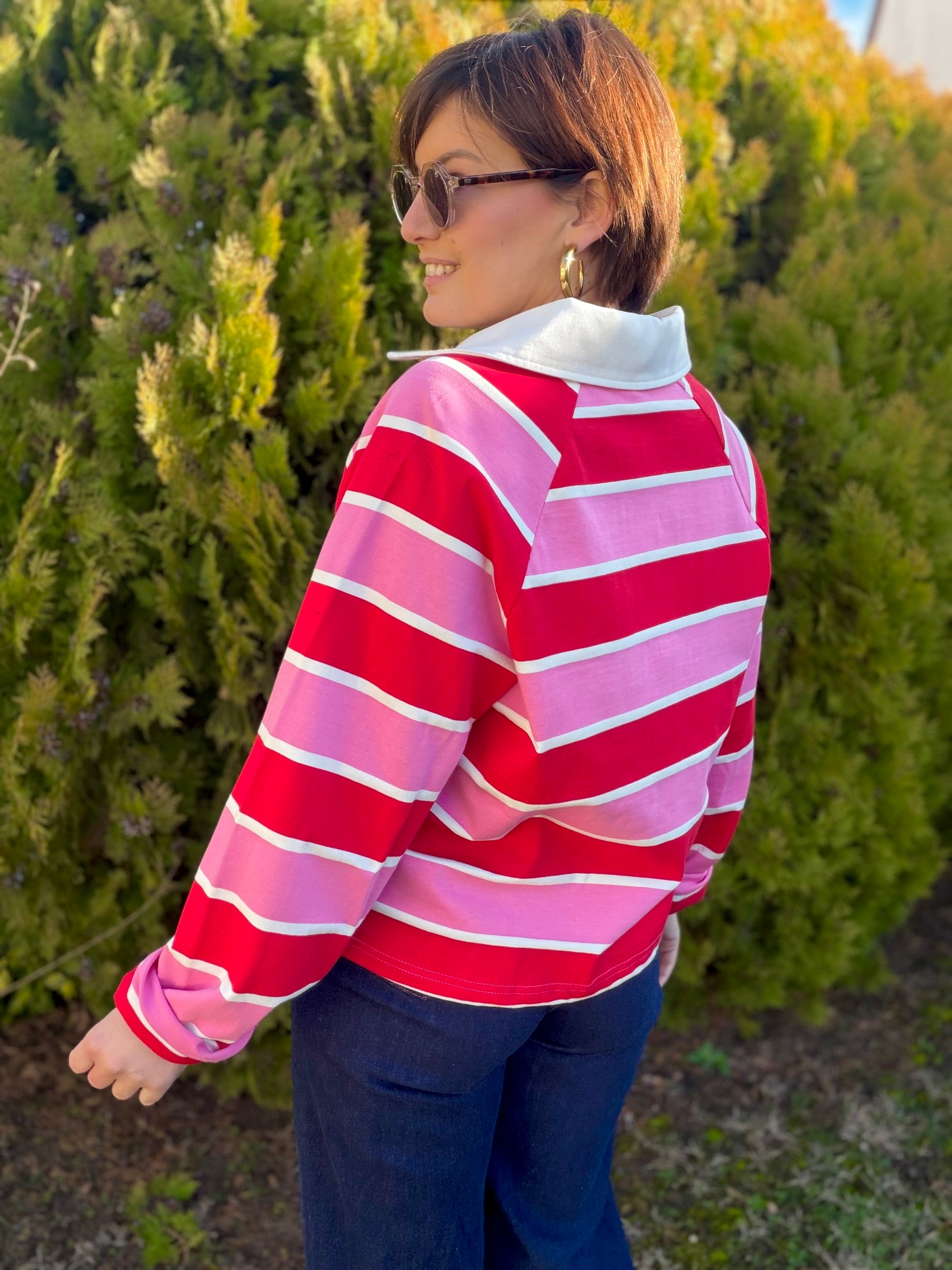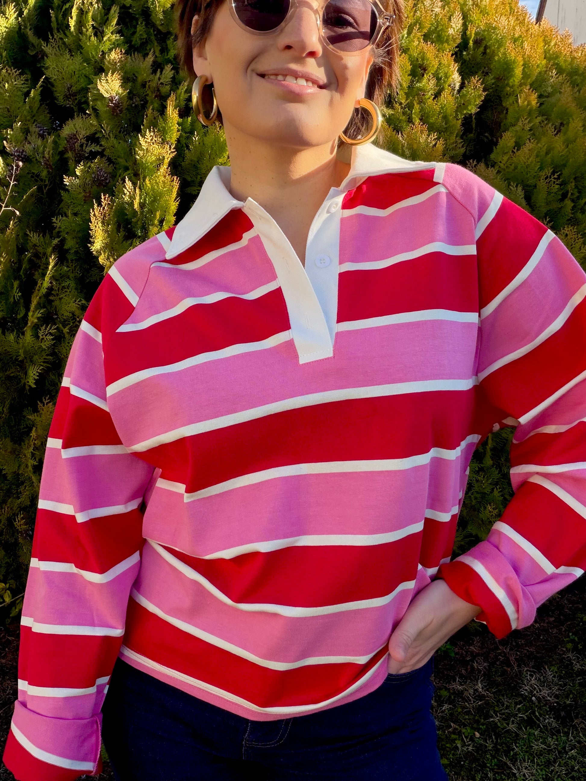Polo manches longues , col chemise , rayé .